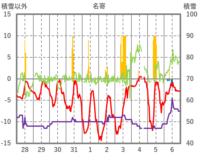 | 日 | 時 | 気温 | 降水 | 風向/風速 | 日照 | 積雪 | 降雪 |