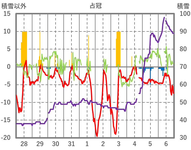 | 日 | 時 | 気温 | 降水 | 風向/風速 | 日照 | 積雪 | 降雪 |