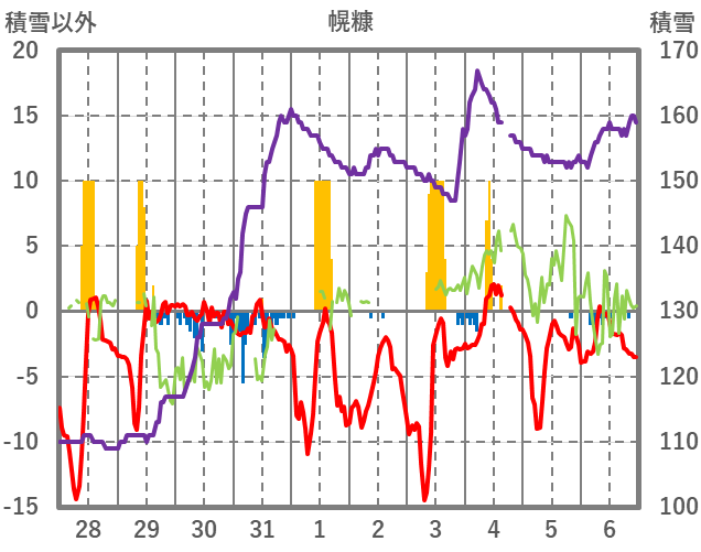 | 日 | 時 | 気温 | 降水 | 風向/風速 | 日照 | 積雪 | 降雪 |