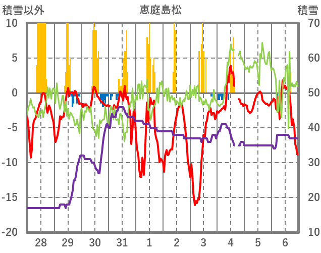 | 日 | 時 | 気温 | 降水 | 風向/風速 | 日照 | 積雪 | 降雪 |