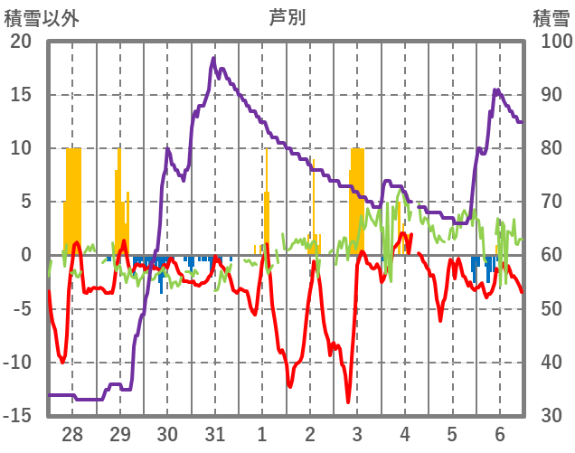 | 日 | 時 | 気温 | 降水 | 風向/風速 | 日照 | 積雪 | 降雪 |