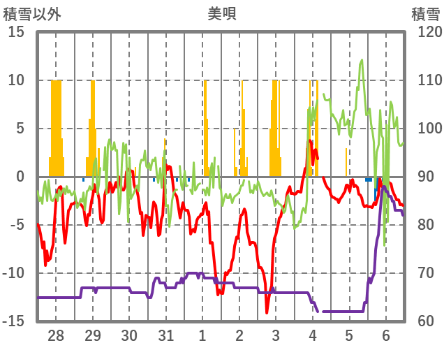 | 日 | 時 | 気温 | 降水 | 風向/風速 | 日照 | 積雪 | 降雪 |