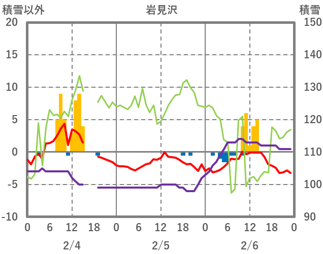 | 日 | 時 | 気温 | 降水 | 風向/風速 | 日照 | 積雪 | 降雪 |