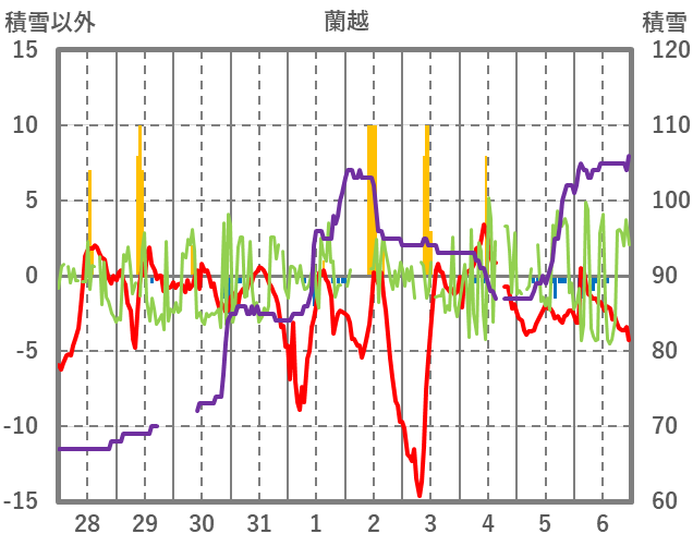 | 日 | 時 | 気温 | 降水 | 風向/風速 | 日照 | 積雪 | 降雪 |