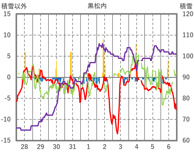 | 日 | 時 | 気温 | 降水 | 風向/風速 | 日照 | 積雪 | 降雪 |