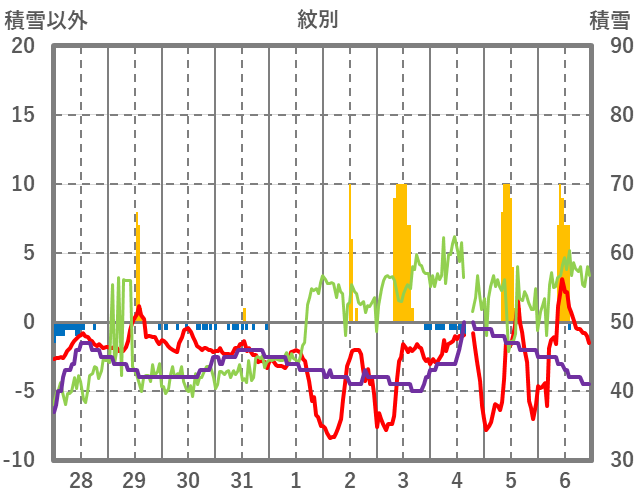 | 日 | 時 | 気温 | 降水 | 風向/風速 | 日照 | 積雪 | 降雪 |