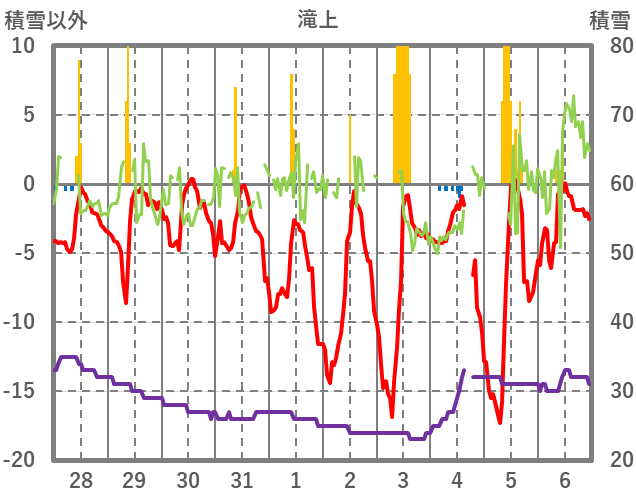 | 日 | 時 | 気温 | 降水 | 風向/風速 | 日照 | 積雪 | 降雪 |