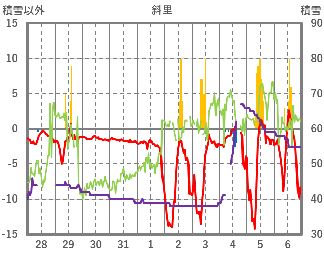 | 日 | 時 | 気温 | 降水 | 風向/風速 | 日照 | 積雪 | 降雪 |