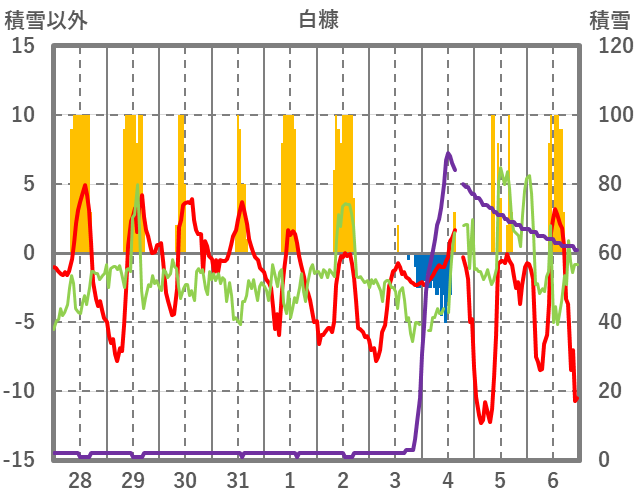 | 日 | 時 | 気温 | 降水 | 風向/風速 | 日照 | 積雪 | 降雪 |