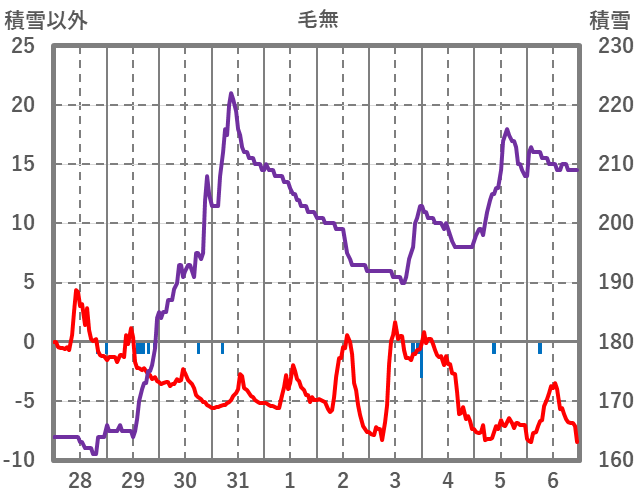 | 日 | 時 | 気温 | 降水 | 風向/風速 | 日照 | 積雪 | 降雪 |