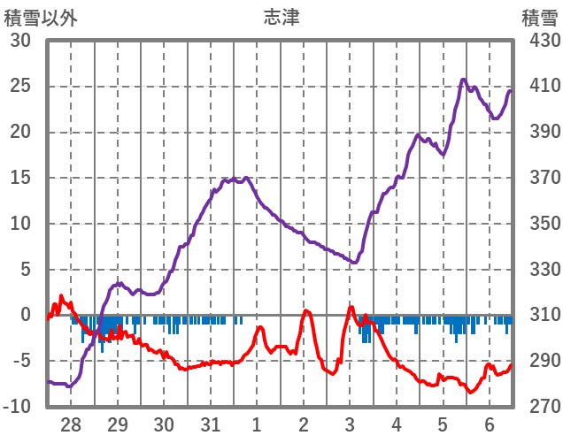 | 日 | 時 | 気温 | 降水 | 風向/風速 | 日照 | 積雪 | 降雪 |