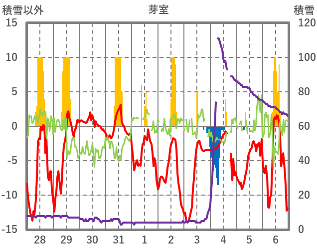 | 日 | 時 | 気温 | 降水 | 風向/風速 | 日照 | 積雪 | 降雪 |