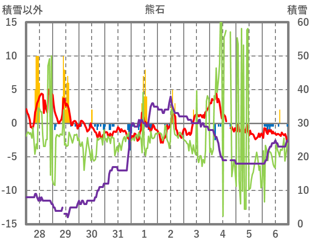 | 日 | 時 | 気温 | 降水 | 風向/風速 | 日照 | 積雪 | 降雪 |