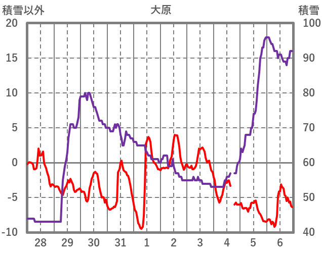 | 日 | 時 | 気温 | 降水 | 風向/風速 | 日照 | 積雪 | 降雪 |