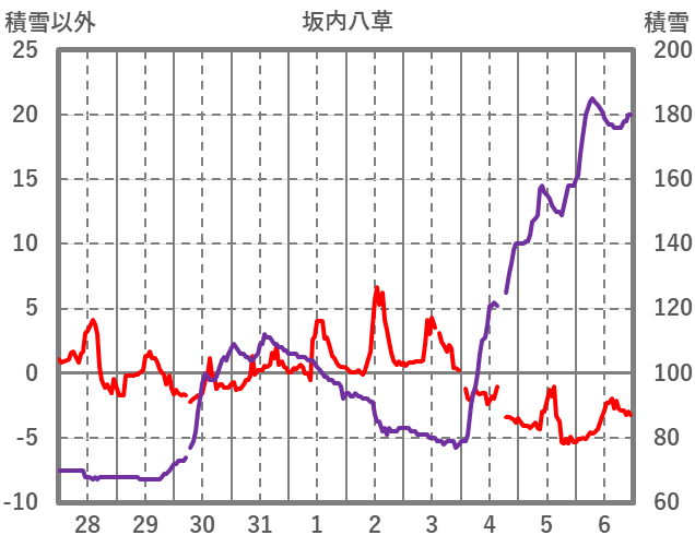 | 日 | 時 | 気温 | 降水 | 風向/風速 | 日照 | 積雪 | 降雪 |