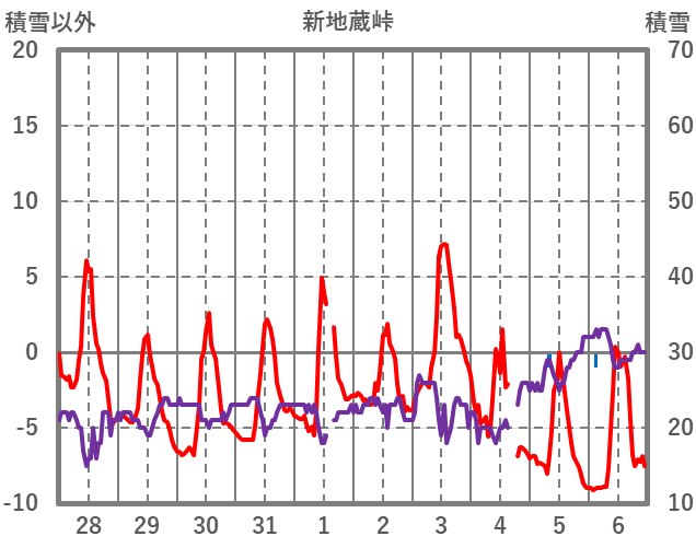 | 日 | 時 | 気温 | 降水 | 風向/風速 | 日照 | 積雪 | 降雪 |
