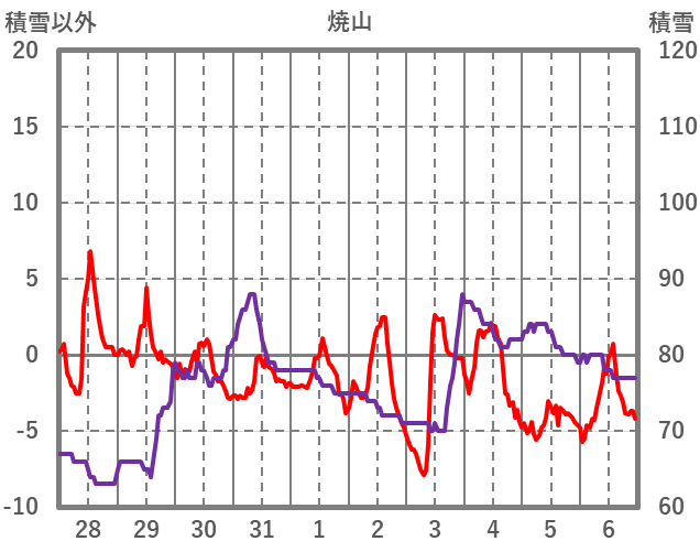 | 日 | 時 | 気温 | 降水 | 風向/風速 | 日照 | 積雪 | 降雪 |