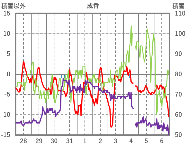 | 日 | 時 | 気温 | 降水 | 風向/風速 | 日照 | 積雪 | 降雪 |