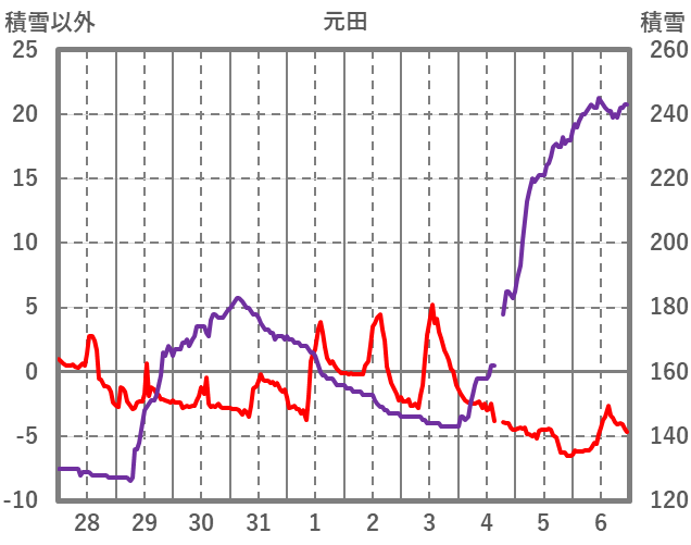 | 日 | 時 | 気温 | 降水 | 風向/風速 | 日照 | 積雪 | 降雪 |