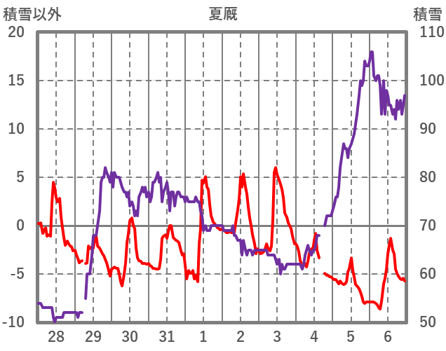 | 日 | 時 | 気温 | 降水 | 風向/風速 | 日照 | 積雪 | 降雪 |