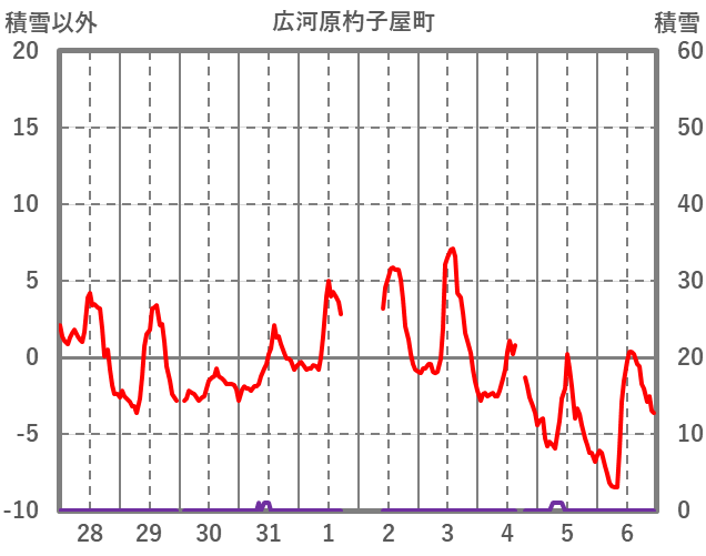 | 日 | 時 | 気温 | 降水 | 風向/風速 | 日照 | 積雪 | 降雪 |