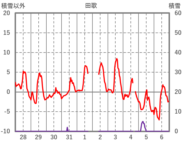 | 日 | 時 | 気温 | 降水 | 風向/風速 | 日照 | 積雪 | 降雪 |