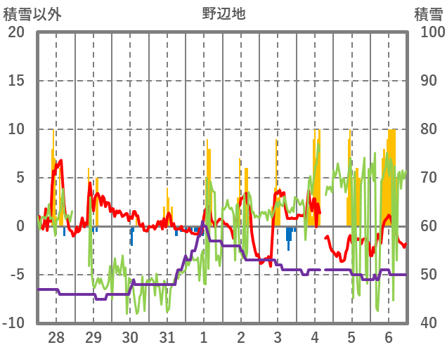 | 日 | 時 | 気温 | 降水 | 風向/風速 | 日照 | 積雪 | 降雪 |