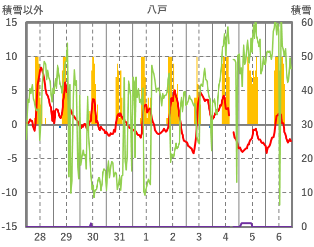 | 日 | 時 | 気温 | 降水 | 風向/風速 | 日照 | 積雪 | 降雪 |