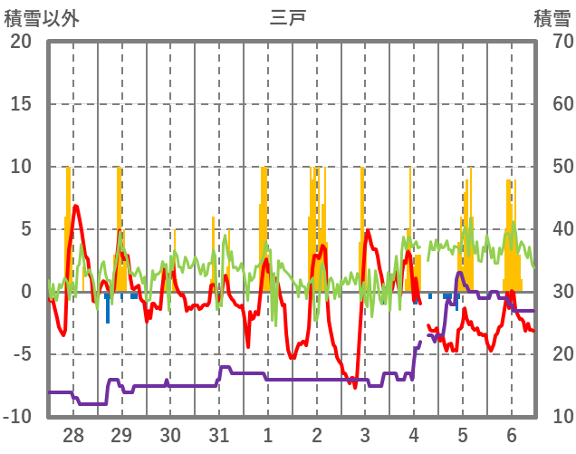 | 日 | 時 | 気温 | 降水 | 風向/風速 | 日照 | 積雪 | 降雪 |