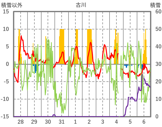 | 日 | 時 | 気温 | 降水 | 風向/風速 | 日照 | 積雪 | 降雪 |