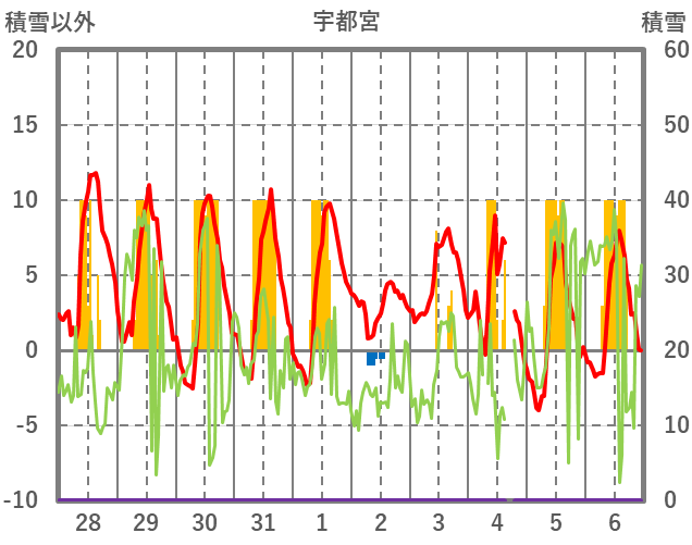 | 日 | 時 | 気温 | 降水 | 風向/風速 | 日照 | 積雪 | 降雪 |