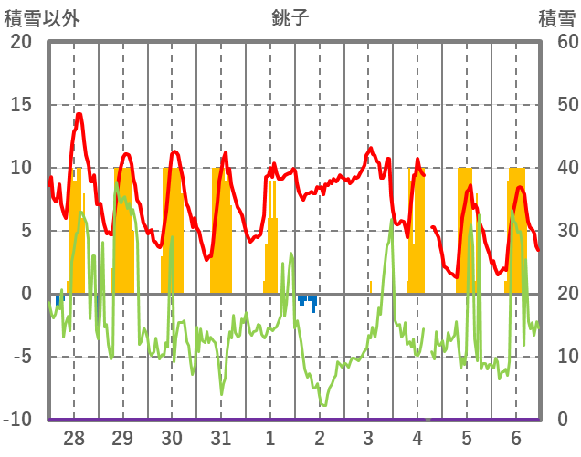 | 日 | 時 | 気温 | 降水 | 風向/風速 | 日照 | 積雪 | 降雪 |