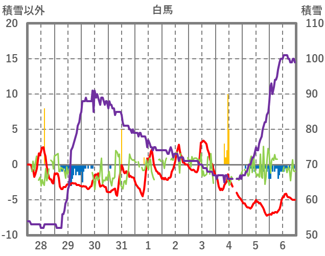 | 日 | 時 | 気温 | 降水 | 風向/風速 | 日照 | 積雪 | 降雪 |
