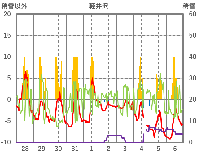 | 日 | 時 | 気温 | 降水 | 風向/風速 | 日照 | 積雪 | 降雪 |