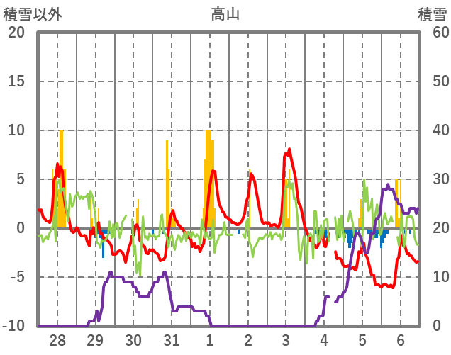 | 日 | 時 | 気温 | 降水 | 風向/風速 | 日照 | 積雪 | 降雪 |