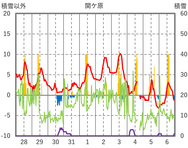 | 日 | 時 | 気温 | 降水 | 風向/風速 | 日照 | 積雪 | 降雪 |