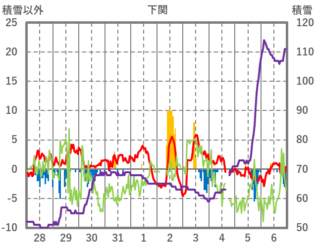 | 日 | 時 | 気温 | 降水 | 風向/風速 | 日照 | 積雪 | 降雪 |
