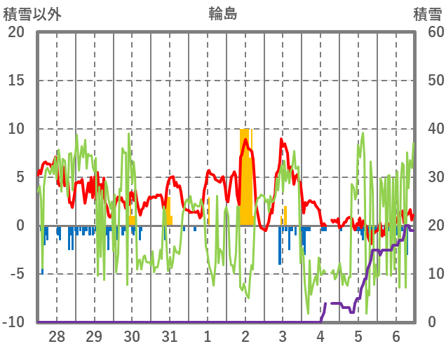 | 日 | 時 | 気温 | 降水 | 風向/風速 | 日照 | 積雪 | 降雪 |