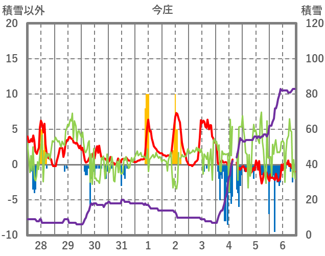 | 日 | 時 | 気温 | 降水 | 風向/風速 | 日照 | 積雪 | 降雪 |