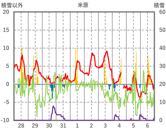 | 日 | 時 | 気温 | 降水 | 風向/風速 | 日照 | 積雪 | 降雪 |
