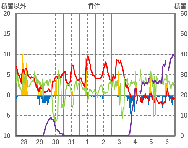 | 日 | 時 | 気温 | 降水 | 風向/風速 | 日照 | 積雪 | 降雪 |