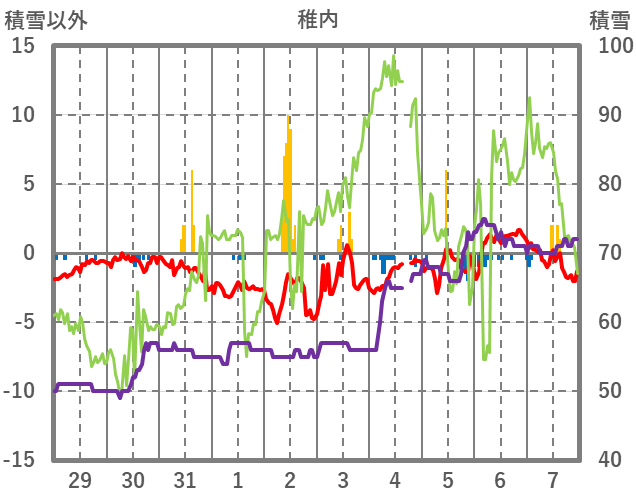 | 日 | 時 | 気温 | 降水 | 風向/風速 | 日照 | 積雪 | 降雪 |