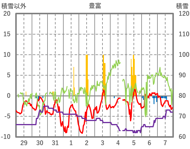 | 日 | 時 | 気温 | 降水 | 風向/風速 | 日照 | 積雪 | 降雪 |