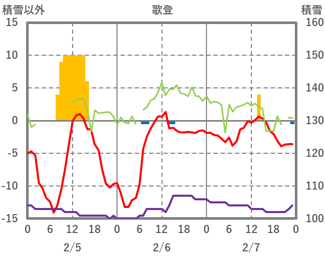 | 日 | 時 | 気温 | 降水 | 風向/風速 | 日照 | 積雪 | 降雪 |