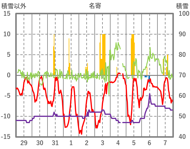 | 日 | 時 | 気温 | 降水 | 風向/風速 | 日照 | 積雪 | 降雪 |