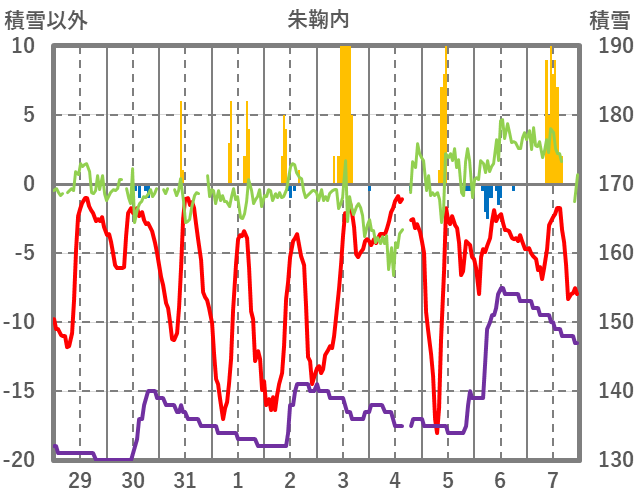 | 日 | 時 | 気温 | 降水 | 風向/風速 | 日照 | 積雪 | 降雪 |