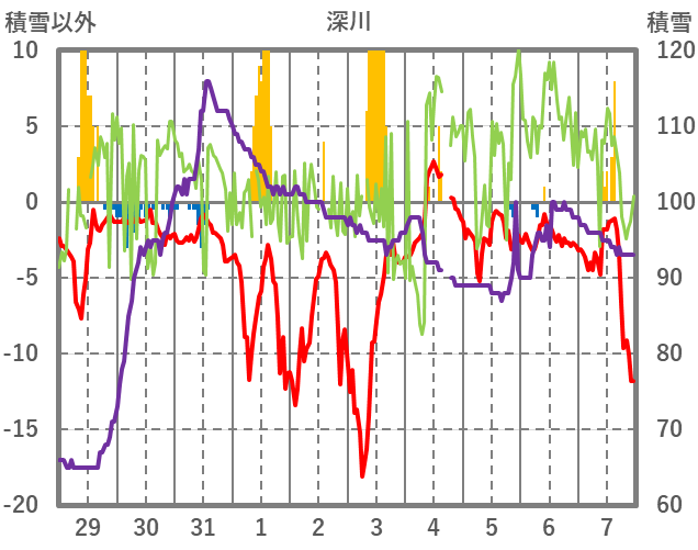 | 日 | 時 | 気温 | 降水 | 風向/風速 | 日照 | 積雪 | 降雪 |