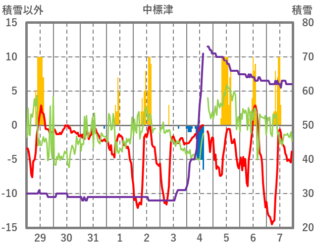 | 日 | 時 | 気温 | 降水 | 風向/風速 | 日照 | 積雪 | 降雪 |