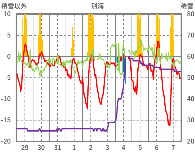 | 日 | 時 | 気温 | 降水 | 風向/風速 | 日照 | 積雪 | 降雪 |