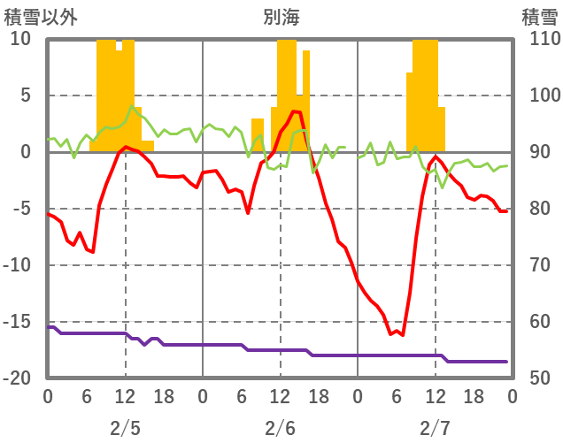 | 日 | 時 | 気温 | 降水 | 風向/風速 | 日照 | 積雪 | 降雪 |